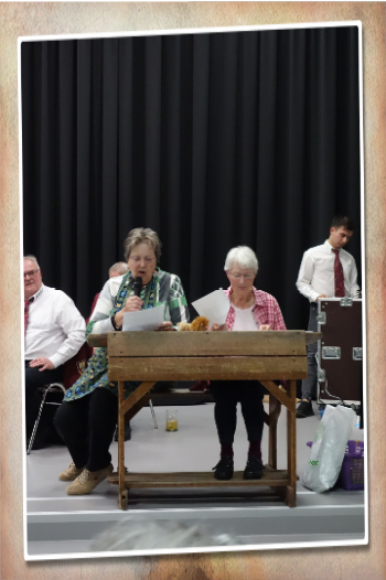 In ihrer gelassenen Art betrat Rotraud Morell die Bühne und nahm auf einer alten Schulbank Platz, die sie vor Jahren aus dem ausgedienten Bestand der Grundschule Ober-Mockstadt erworben hatte und seitdem in ihrer Wohnung einen Sonderplatz einnimmt sowie bei Auftritten als Bühnenrequisite dient. In den, in drei Blöcken unterteilten Geschichten „Vom Essen und Trinken“, „Mann und Frau“ und „Sternstunden der Partnerschaft“ erfuhren die Gäste auf humorvolle Weise mehr über Land und Leute in Oberhessen. So konnte sie von tollen Typen aus Stadt und Land berichten, kannte sich mit dem Anbaggern im Vogelsberg aus, wusste, was auf der Treibjagd passierte und was es mit seinem letzten Wunsch oder mit Friedrich Schillers Handschuh auf sich hatte. Auch erzählte sie von sich und dem Großfürsten, der heute noch die Hand über sie hält, da beide aus Darmstadt kommen und berichtete, mit Unterstützung der aus dem Publikum aufgerufenen Sieglinde Loh, über Sinn und Zweck der Schürze vor 100 Jahren.