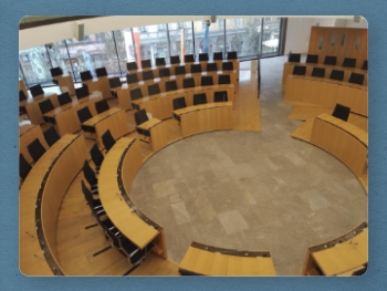RANSTADT (mü). Zu einem vorweihnachtlichen Besuch des hessischen Landtags und des Wiesbadener Sternschnuppen-Weihnachtsmarktes ist kürzlich der Kulturkreis Großgemeinde Ranstadt in die Landeshauptstadt aufgebrochen. Vor Ort im Stadtzentrum angekommen, wurde die große Gruppe von dem Landtagsangestellten Hendrik Schücke sowie Stadtführer Thomas Martin begrüßt und erhielt zahlreiche Erläuterungen zur Geschichte des Hauses, das 1946 im ehemaligen Stadtschloss der nassauischen Herzöge und seinen angrenzenden Liegenschaften etabliert wurde. Dabei wurde der 1962 in Betrieb genommene alte Plenarsaal 2004 abgerissen und durch einen 2008 eingeweihten, großzügigen und bewusst transparent gehaltenen Neubau ersetzt - siehe Bild mit Besuchertribüne und Redner-, Vorsitzenden-, Beisitzer- und Schriftführer-Plätzen.